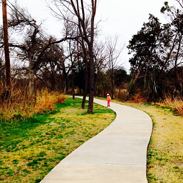 Later, the Lady and I set out on a walk. She is too big for strollers and tricycles these days. We took the long way through the neighborhood, along the creek path, and home again. I had to jog to keep up with her on her scooter.